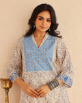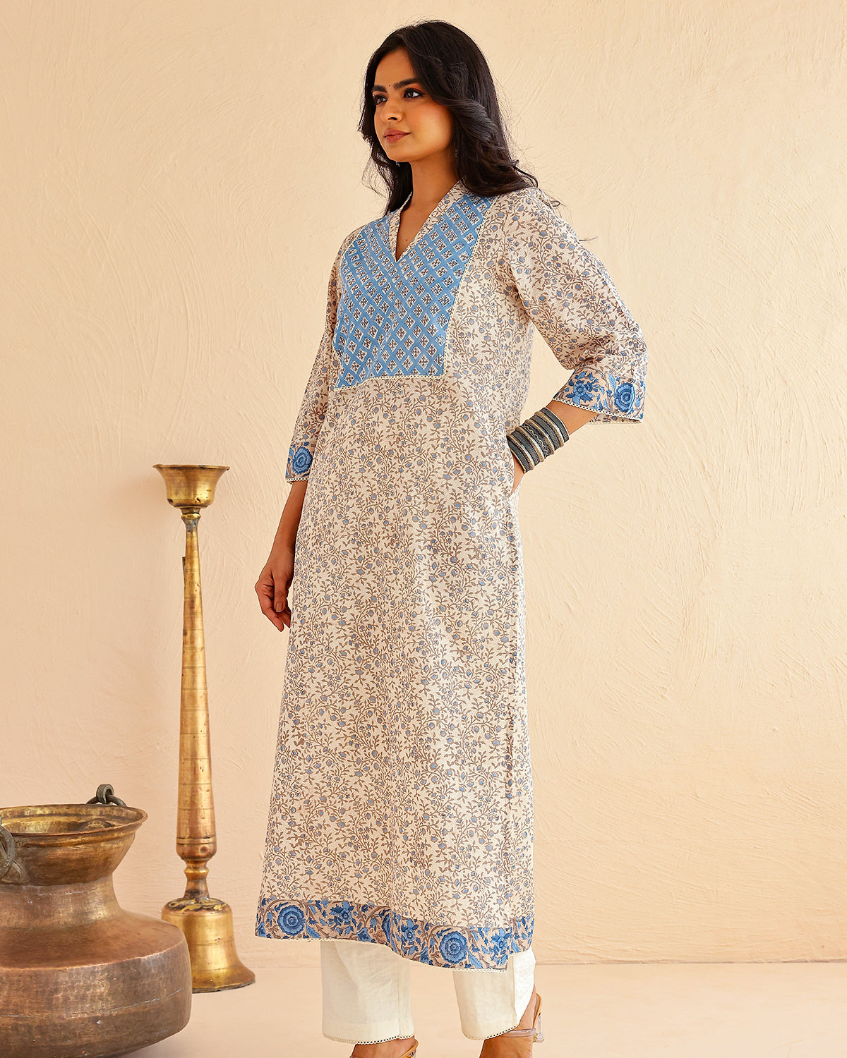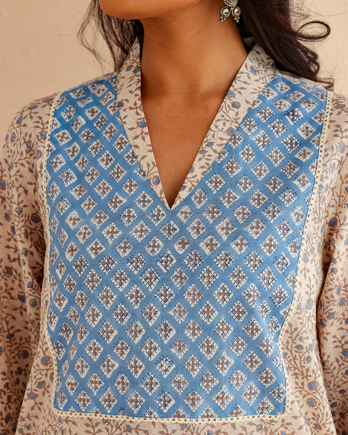Block printed straight kurta in shades of blue and beige. A contrast colour yoke with V neck and lace detailing, highlights the front. The hem and sleeve cuff feature a printed border with delicate lace detailing.