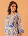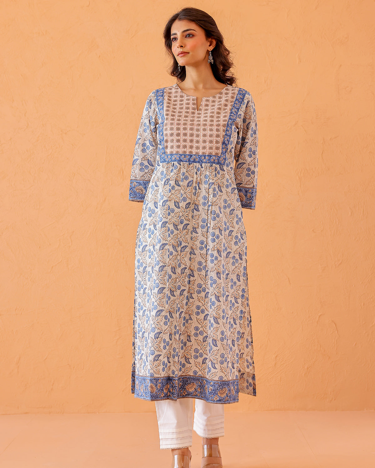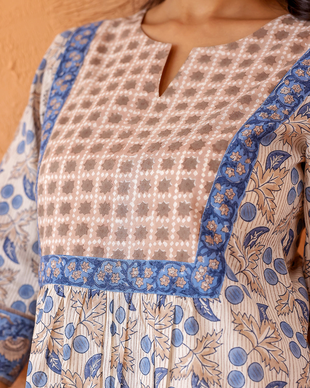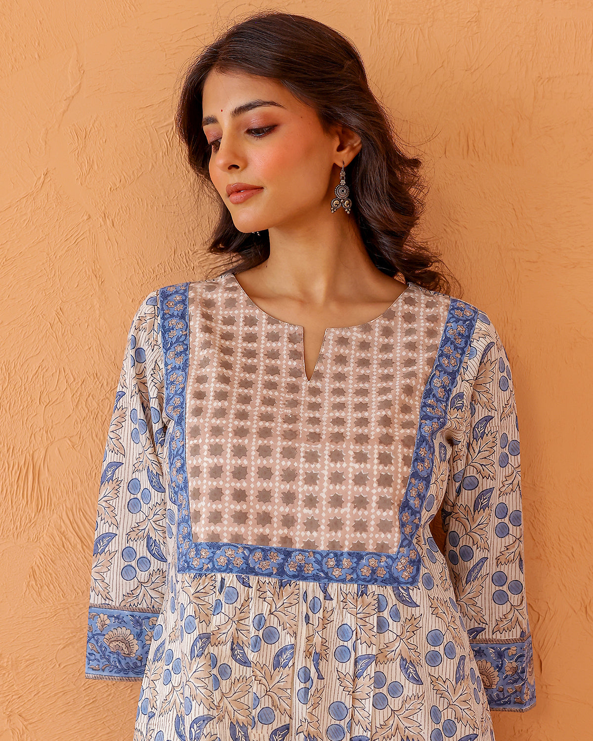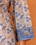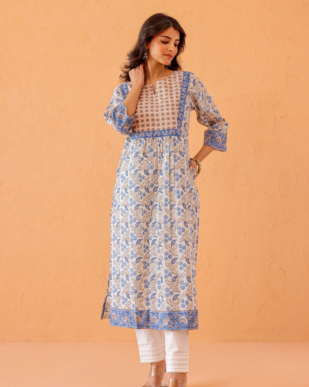 Hand crafted cotton kurta in a traditional leaf print pattern. Straight silhouette with a yoke and slight gathers at the front. Printed border highlights the sleeve and hem.