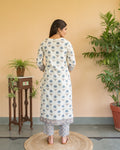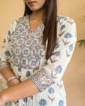 Straight kurta hand block printed with blue chrysanthemum butas. Featuring a geometric print yoke with gathers at front and border detailing at sleeve cuff and hem.