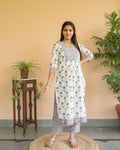 Pair it with Straight Pants printed in blue geometric design and dupatta in Chanderi/ Mul with delicate hand stitched hemming.