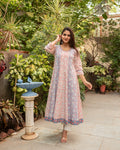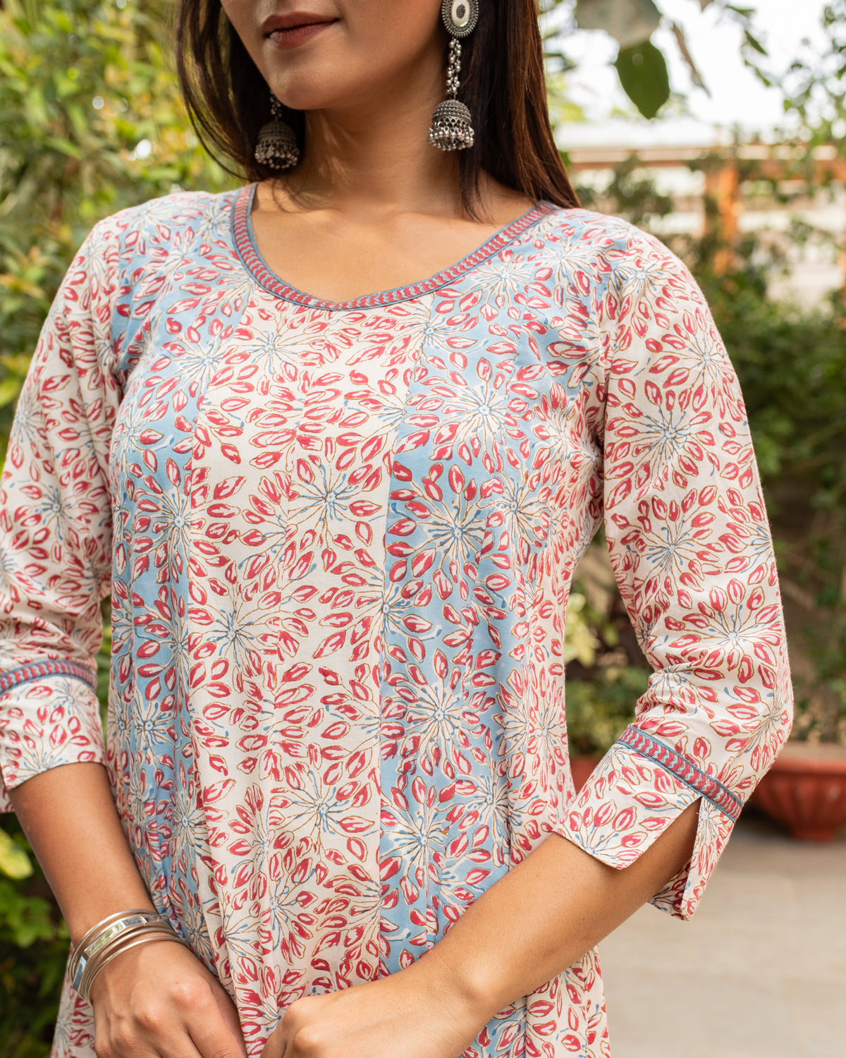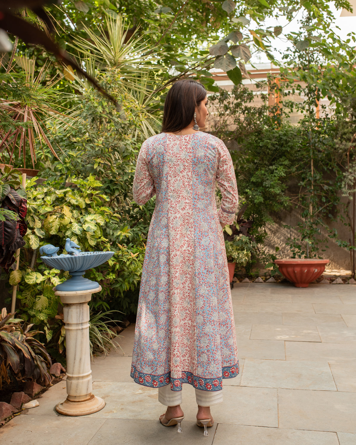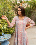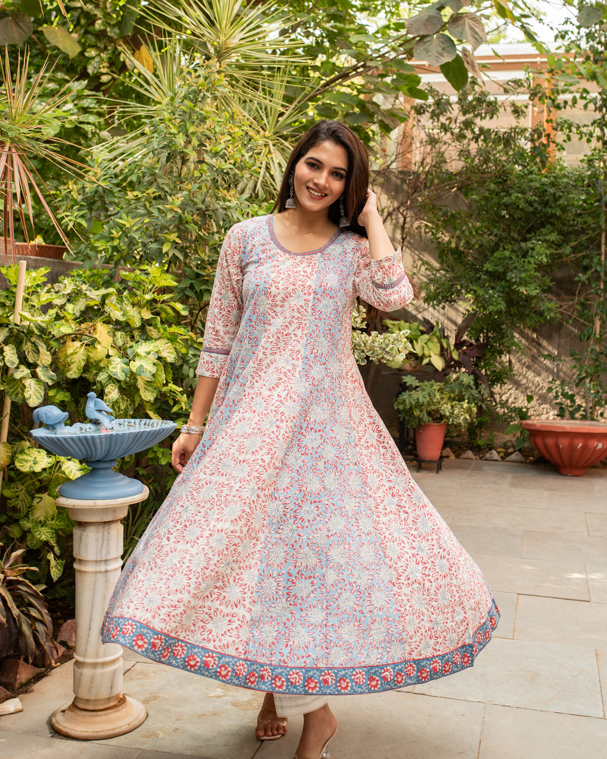 Hand block printed kali kurta with complimentary print panels. Featuring a round neckline with border detailing on sleeve and hem.