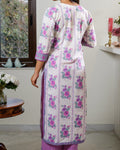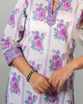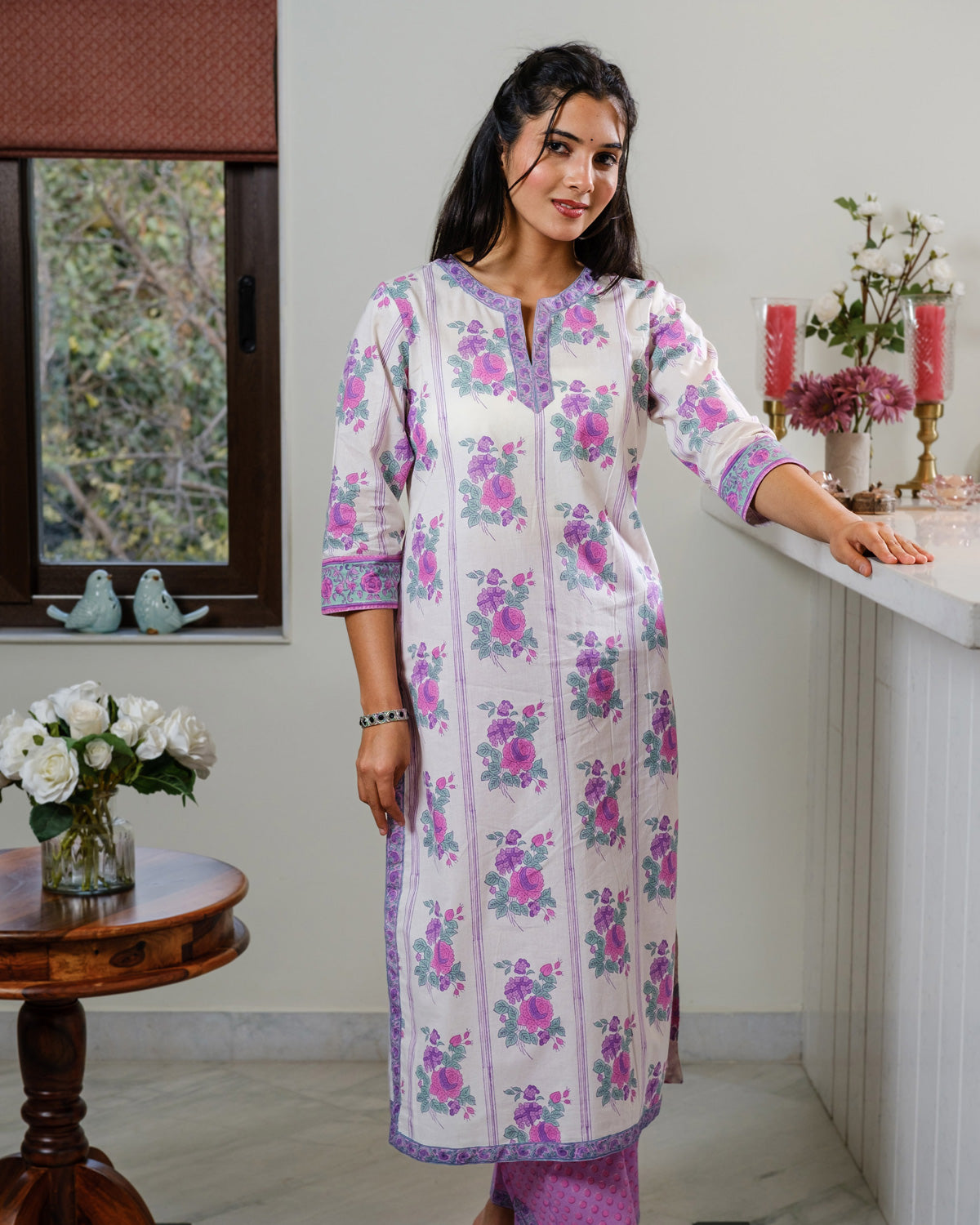 Straight cut kurta hand block printed in Rose motif with border detailing on the neckline, sleeve and hem.