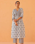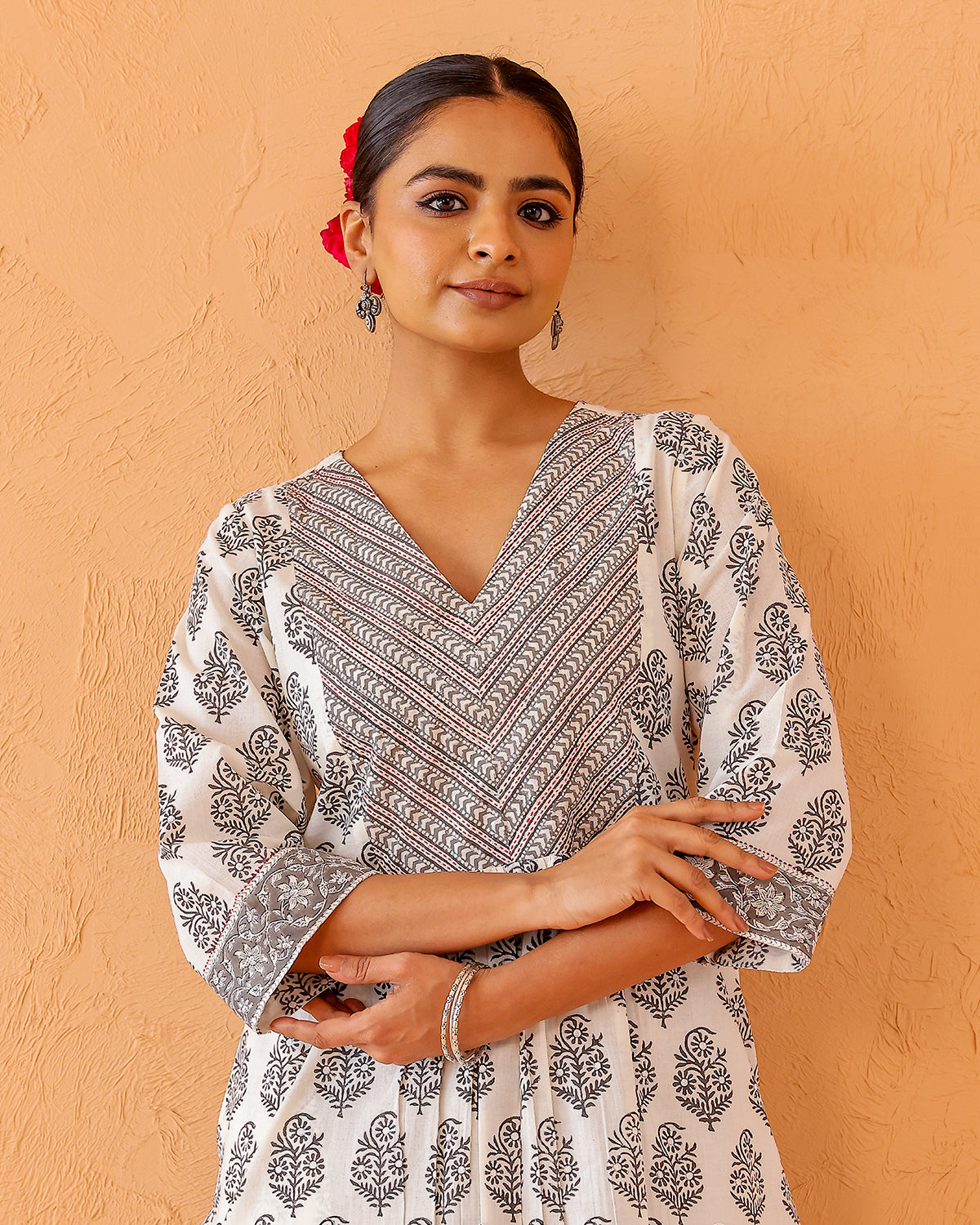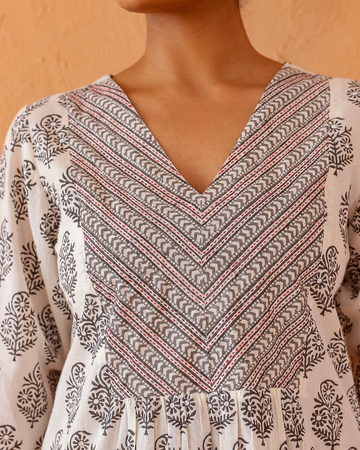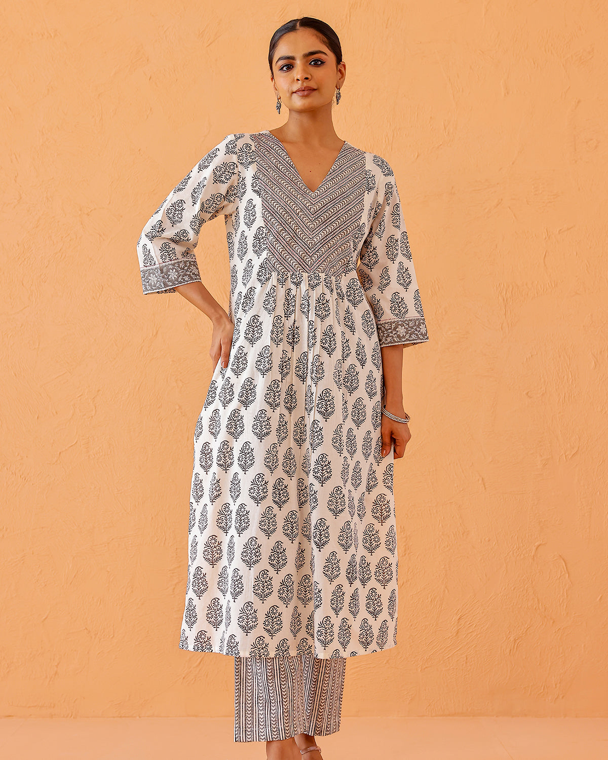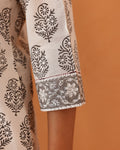 Buta print Kurta with a striking yoke, featuring a V neck and hand done embroidery. Light gathers at the front with printed border at the sleeve cuff.