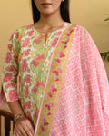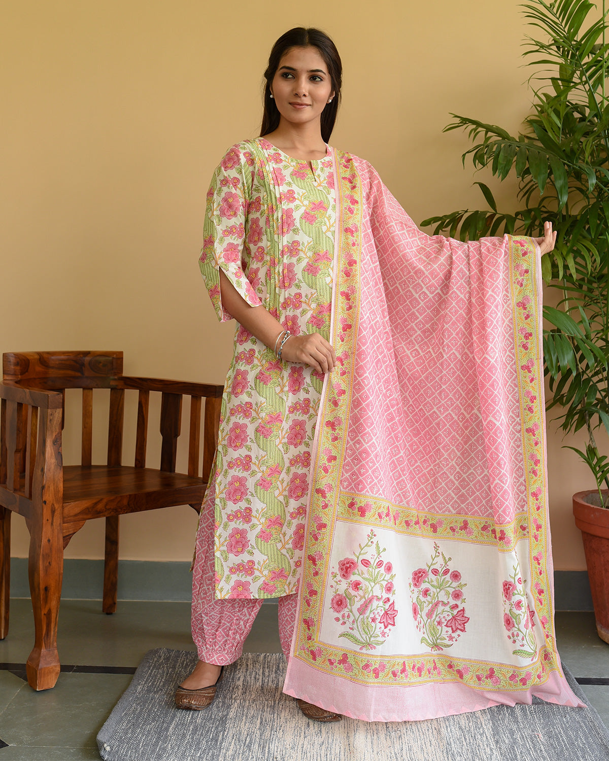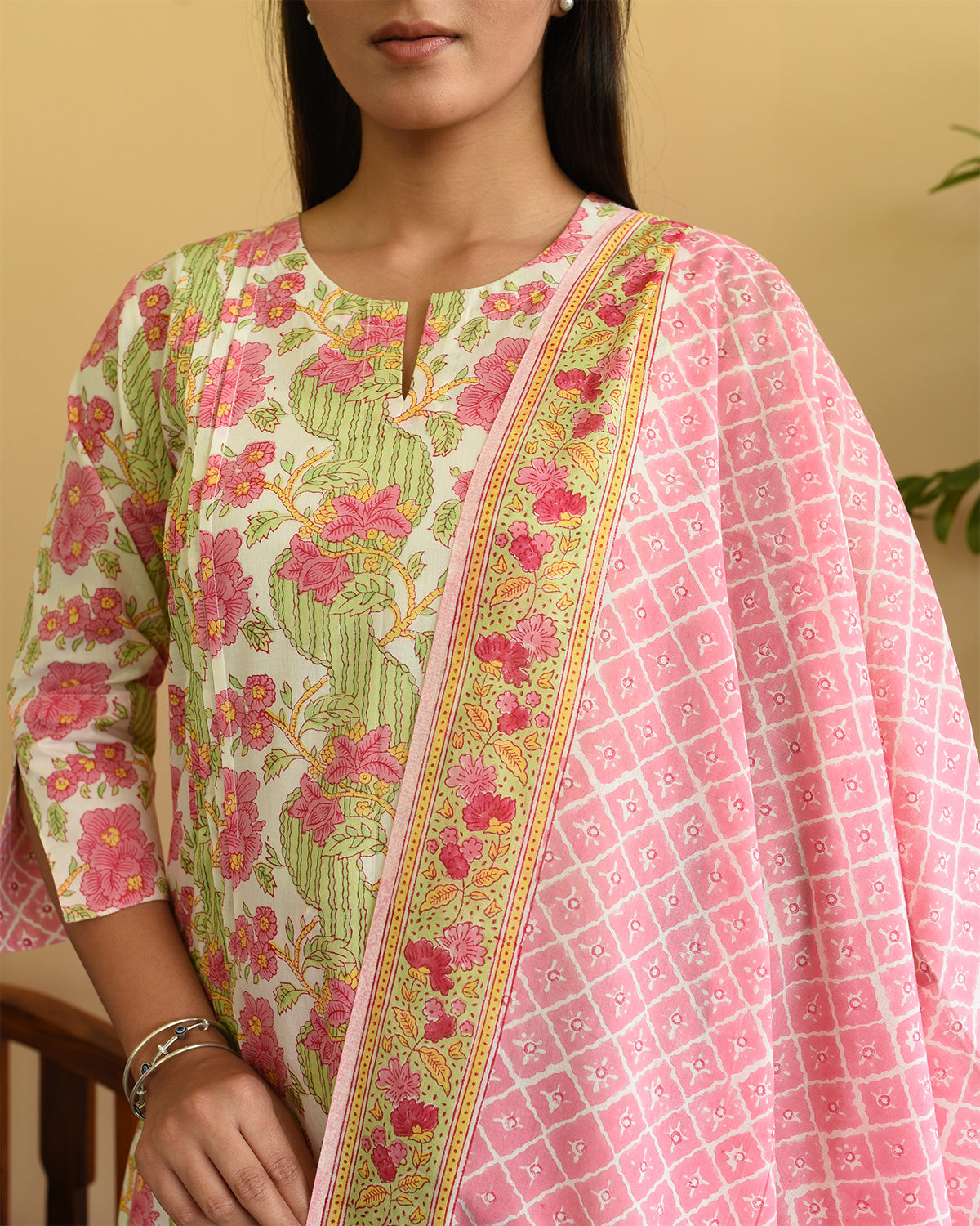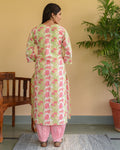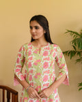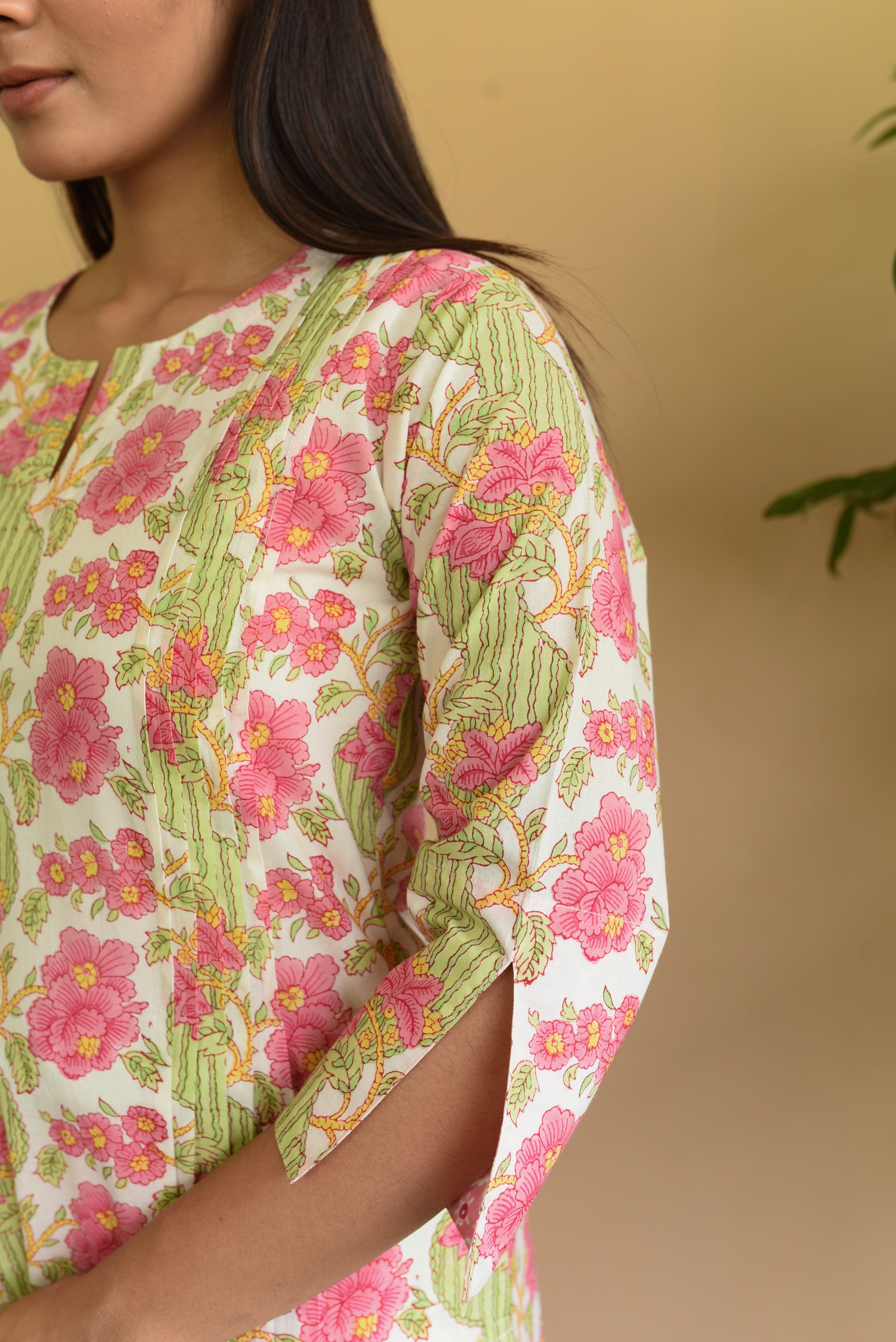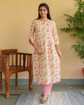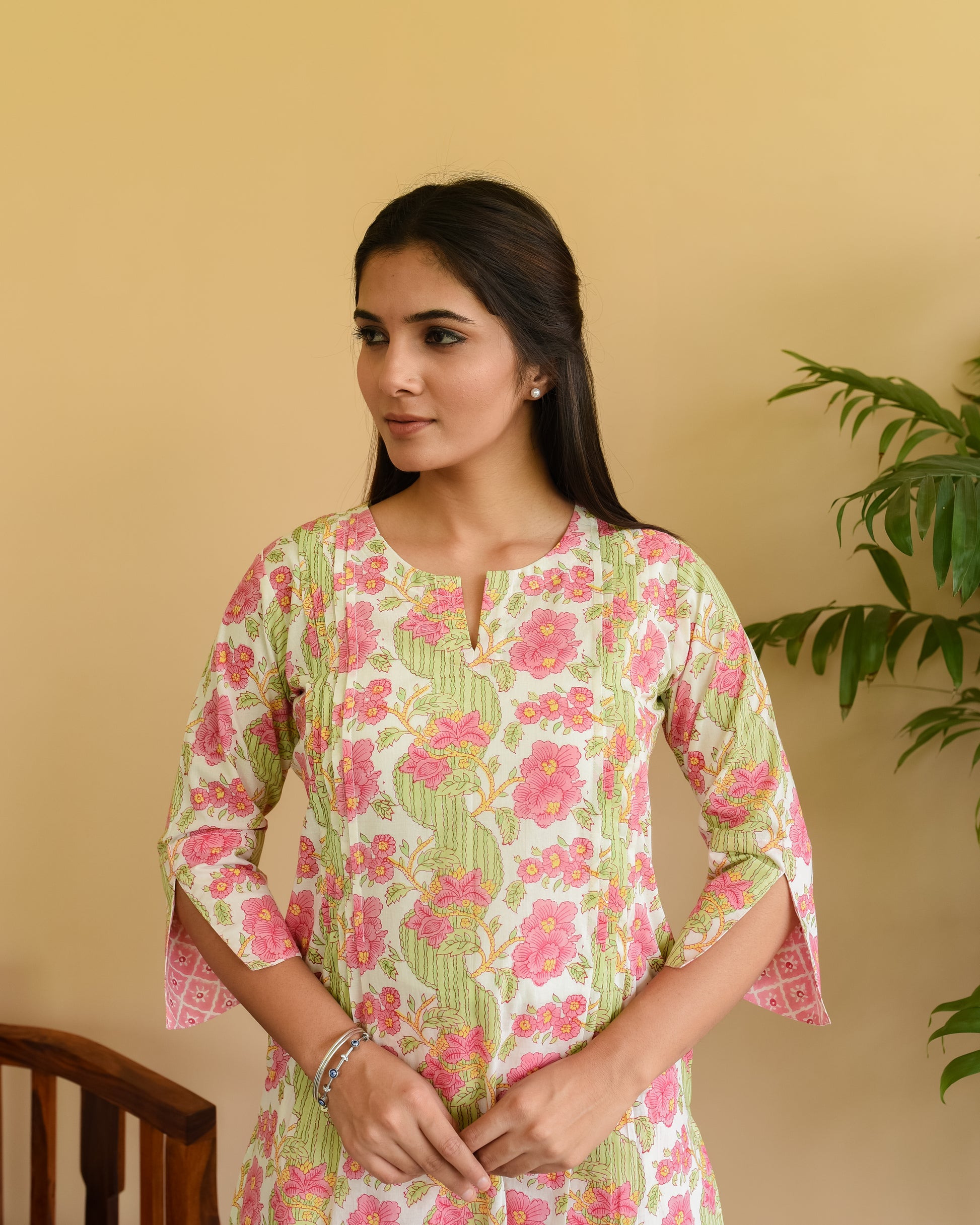Hand block printed floral jaal straight kurta with pleat details at front. Featuring complementary print patch detail at sleeve cuff.
