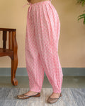 Pair it with printed Afghani pants with elasticated back and draw strings at front and matching dupatta in Chanderi/ Mul with delicate hand stitched hemming.