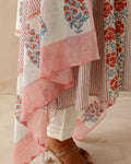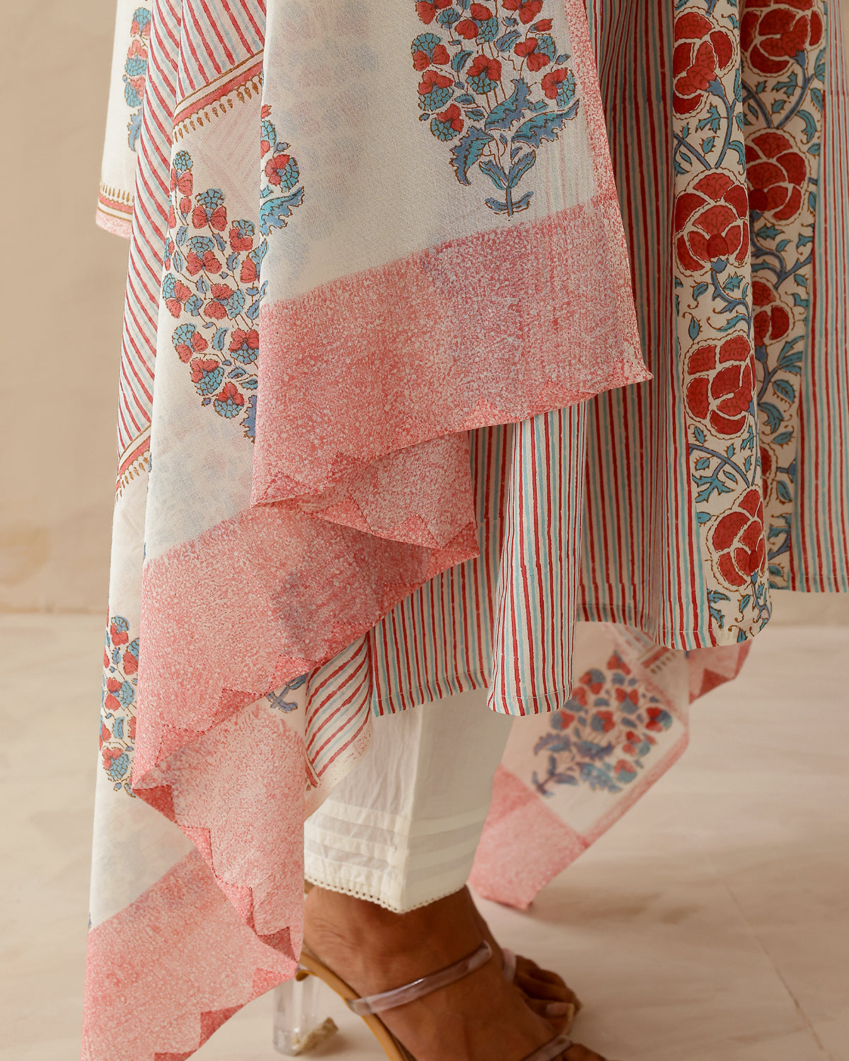 Hand block printed cotton kurta with pansy flower print on front, back and sleeves. The side panels are printed in fine stripes. The kurta features a round neckline with stripe patti. Paired with natural white narrow pleated Pants, featuring an elasticated waist with drawstrings and deep pockets on either sides and buta print Chanderi/ Mul-Mul dupatta with delicate hand stitched hemming