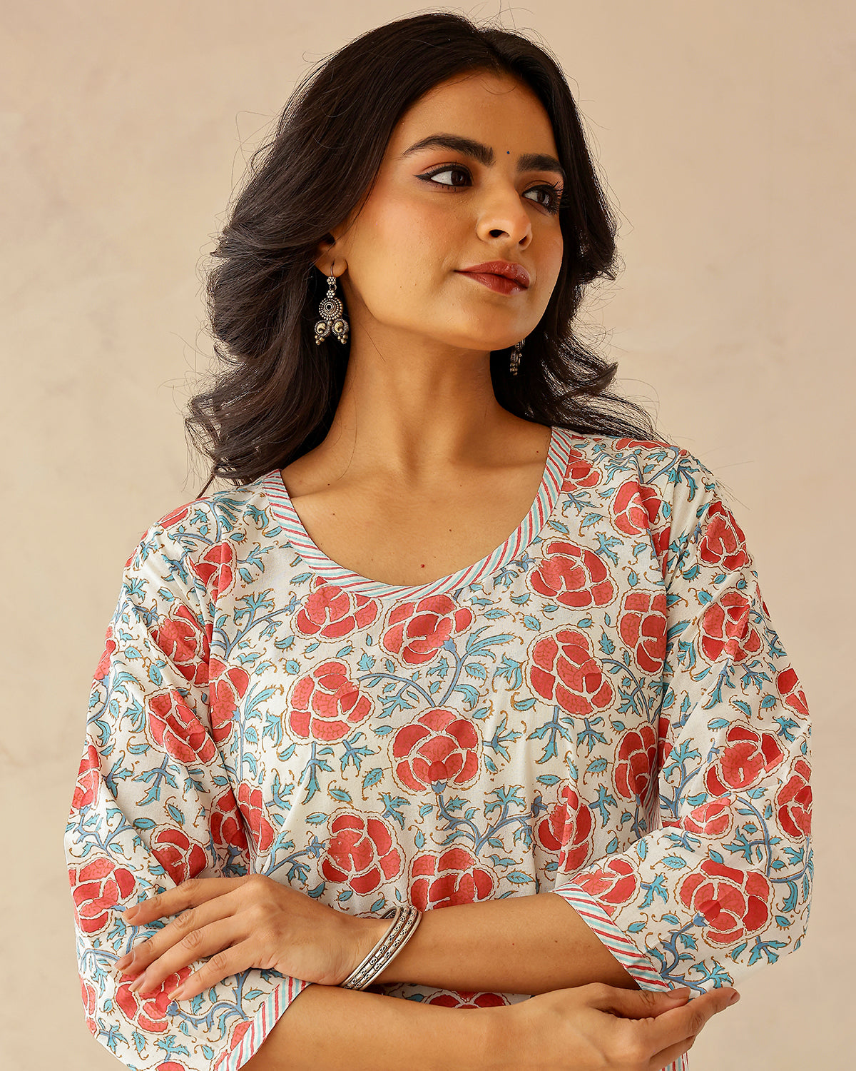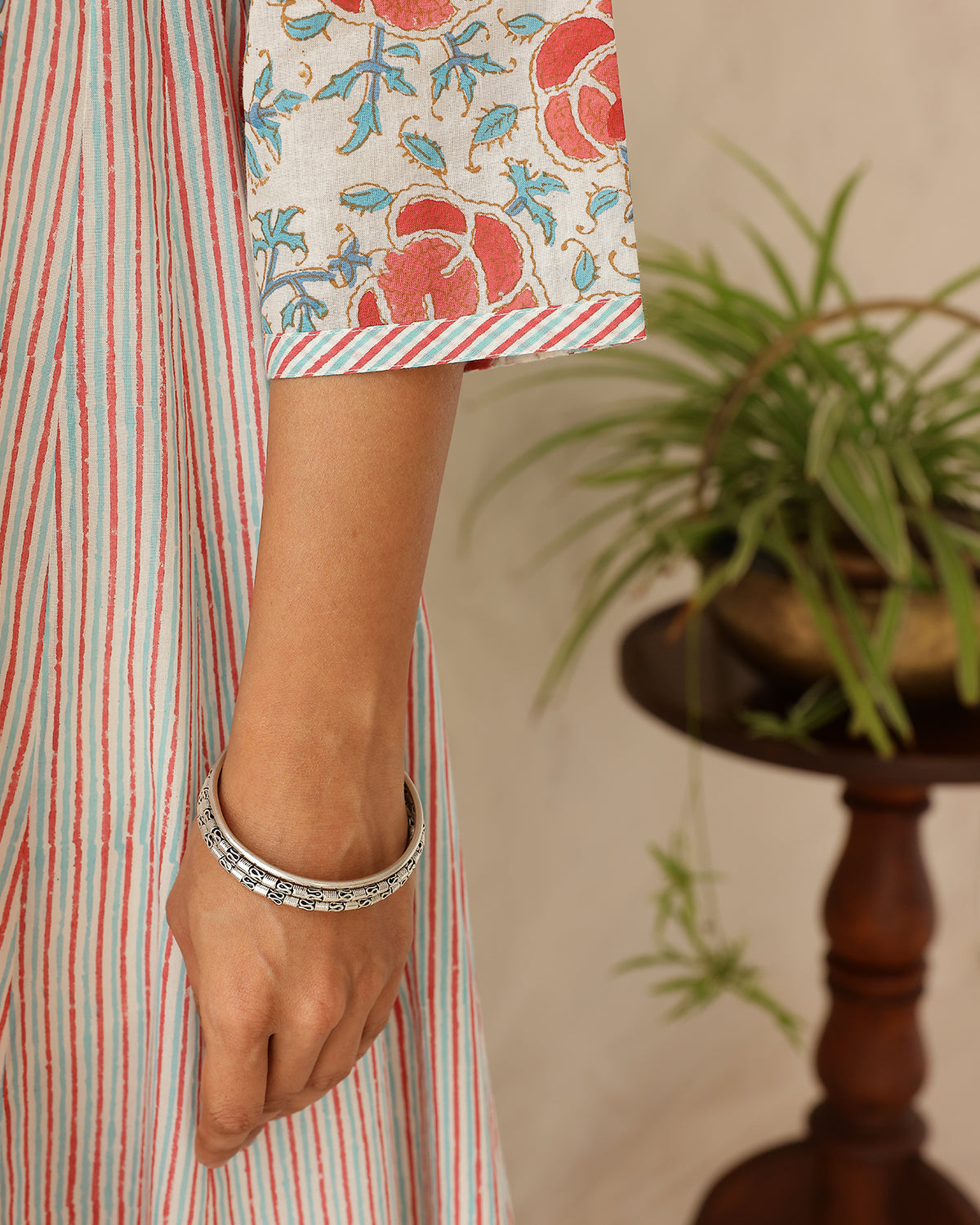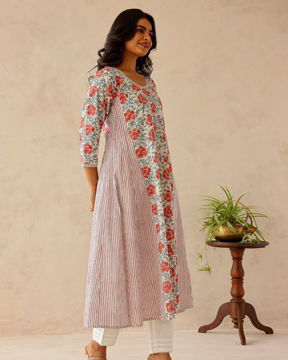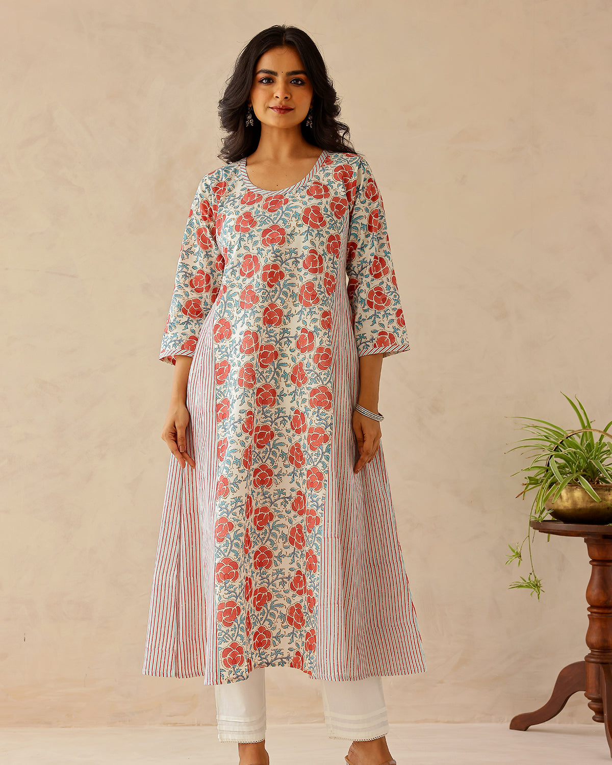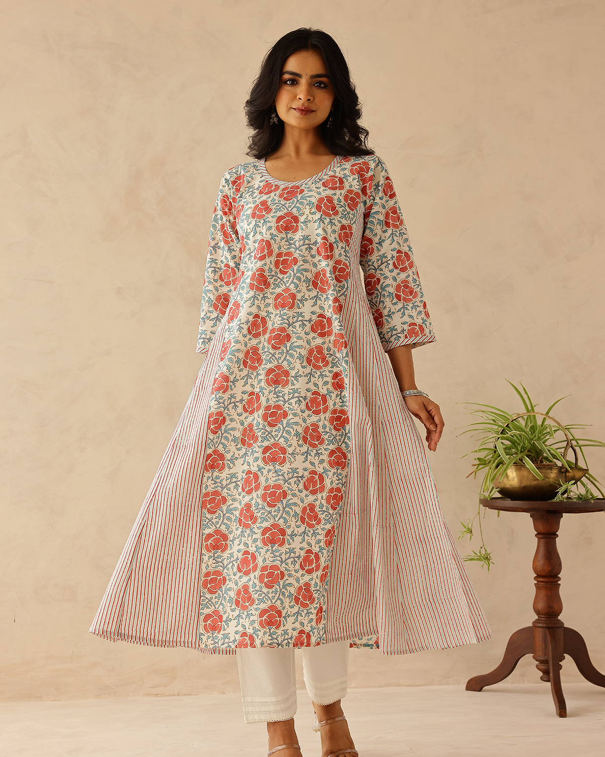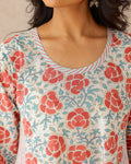 Hand block printed cotton kurta with pansy flower print on front, back and sleeves. The side panels are printed in fine stripes. The kurta features a round neckline with stripe patti.