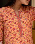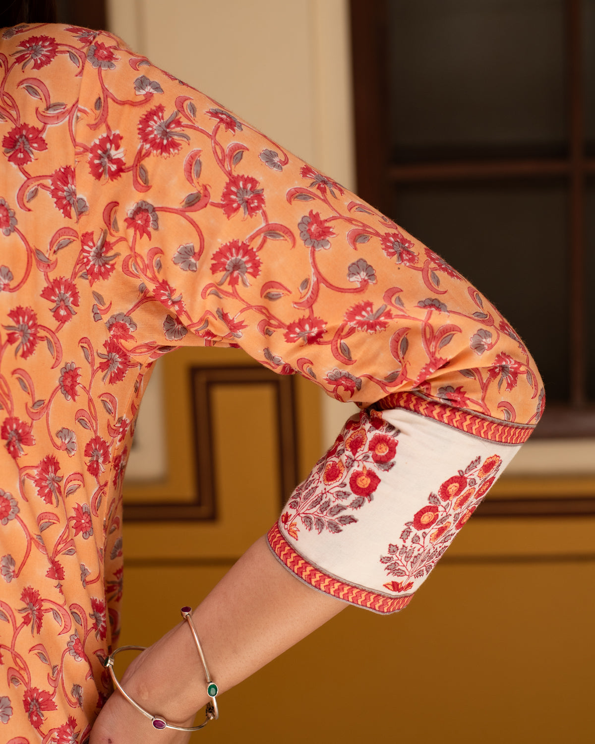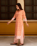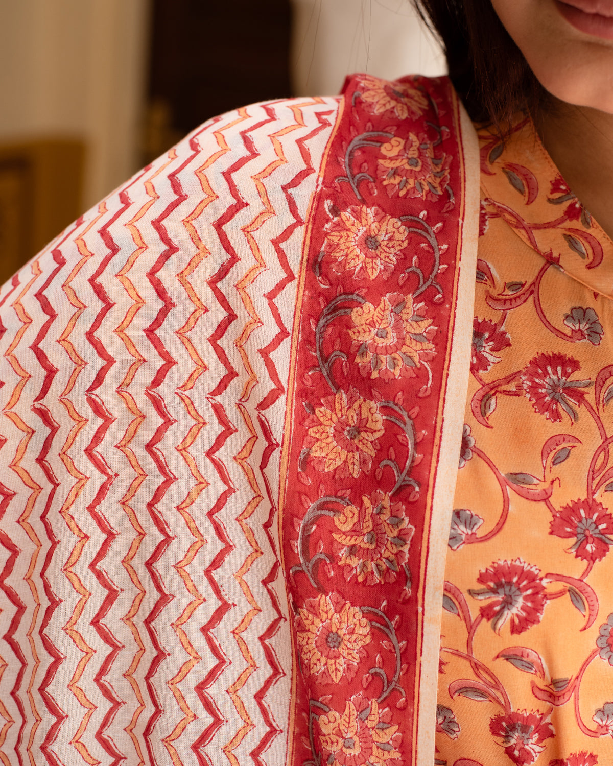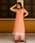 Sanganeri Jaal hand block printed kurta in a straight silhouette with delicate border and buta detailing at cuff and hem. Pair it with printed Lehriya wide leg Pants with border detailing and matching dupatta in Chanderi/ Mul/ Kota with delicate hand stitched hemming.