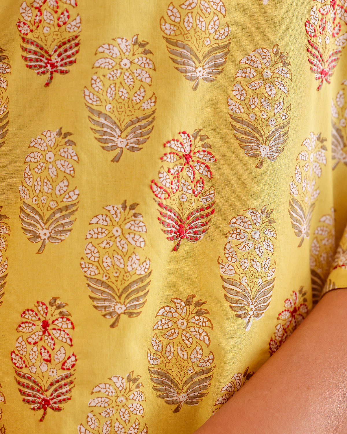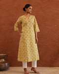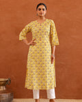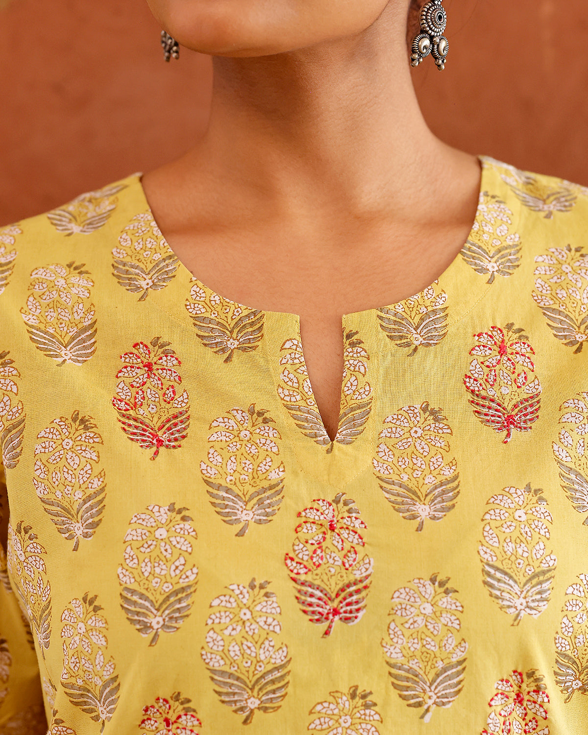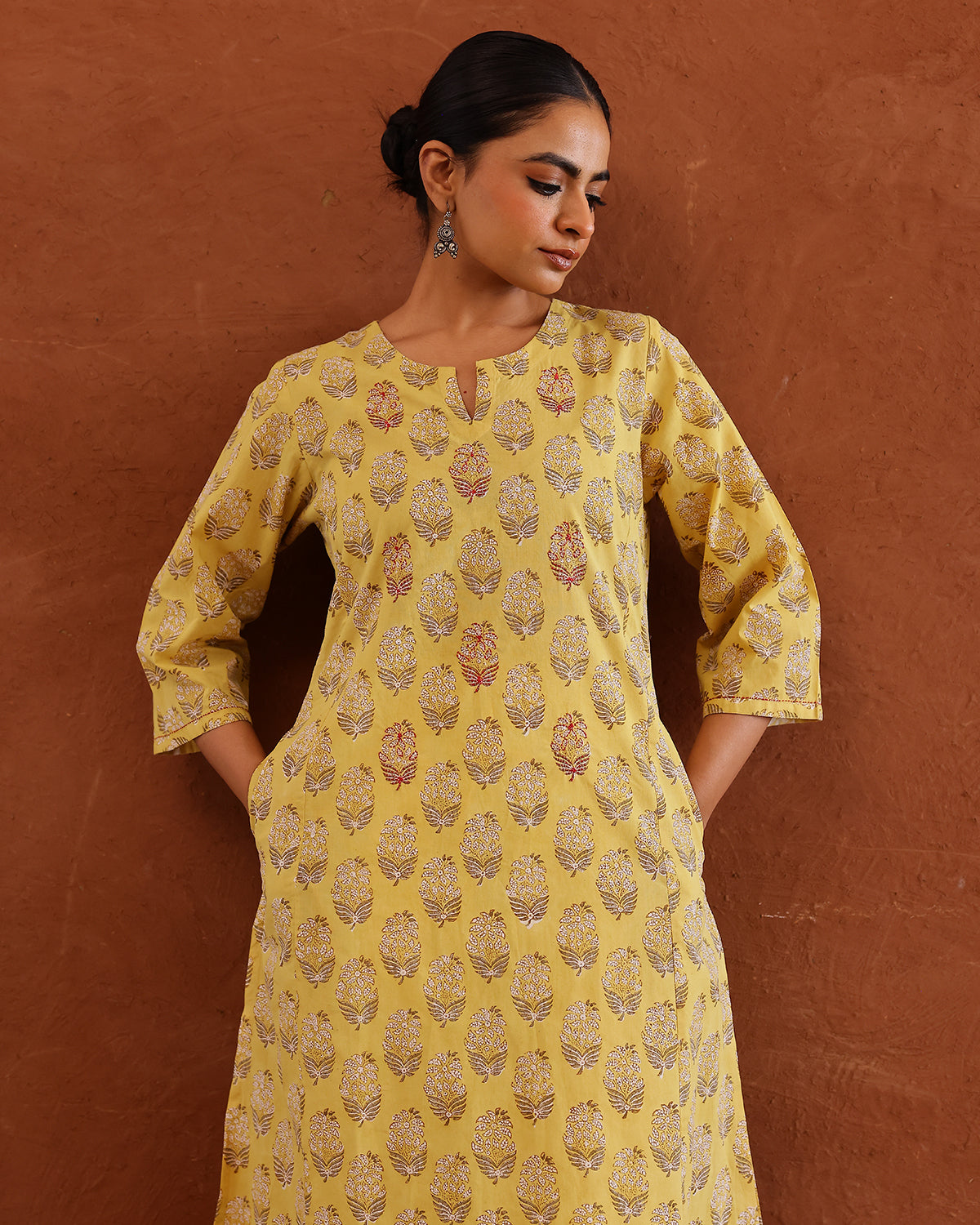 Block printed straight kurta with a buti print. This classy kurta features intricate hand embroidery detailing at the front and sleeves.