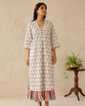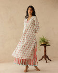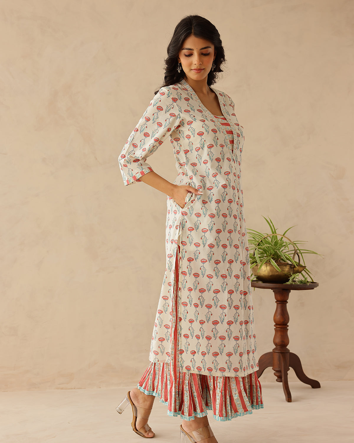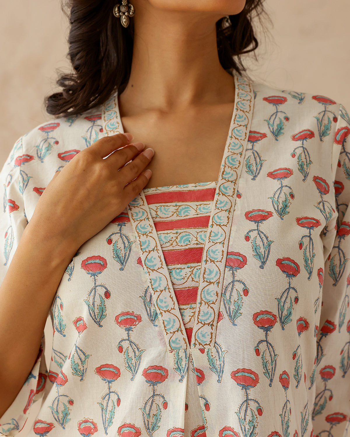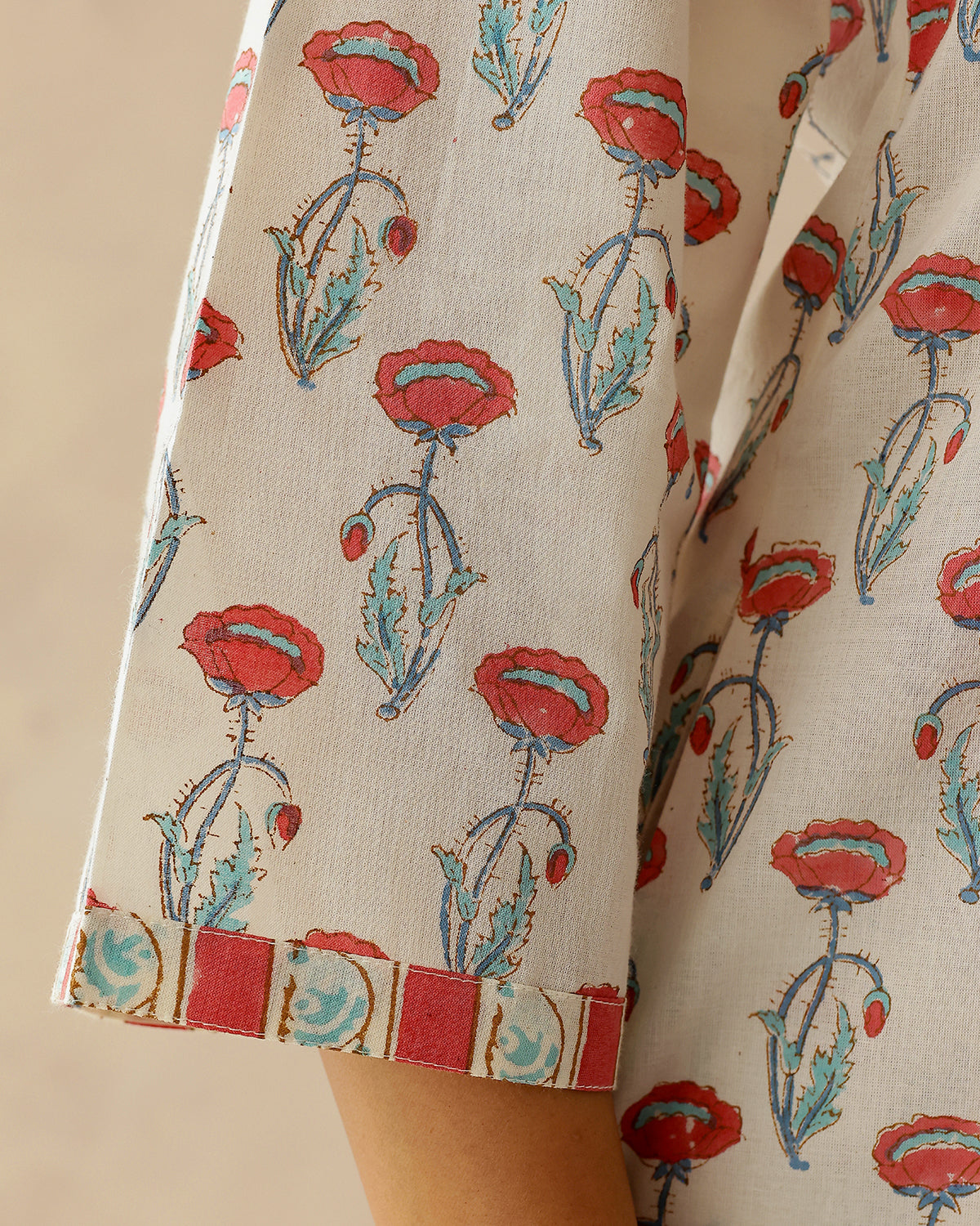 Hand crafted cotton kurta with poppy flower print. The V neck is highlighted by a border and parcha print patch. The soft cotton kurta features a pleat at the front and printed patti on the sleeve.