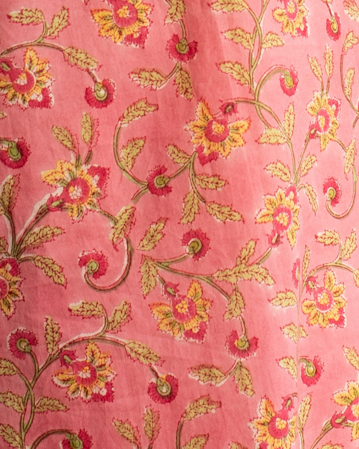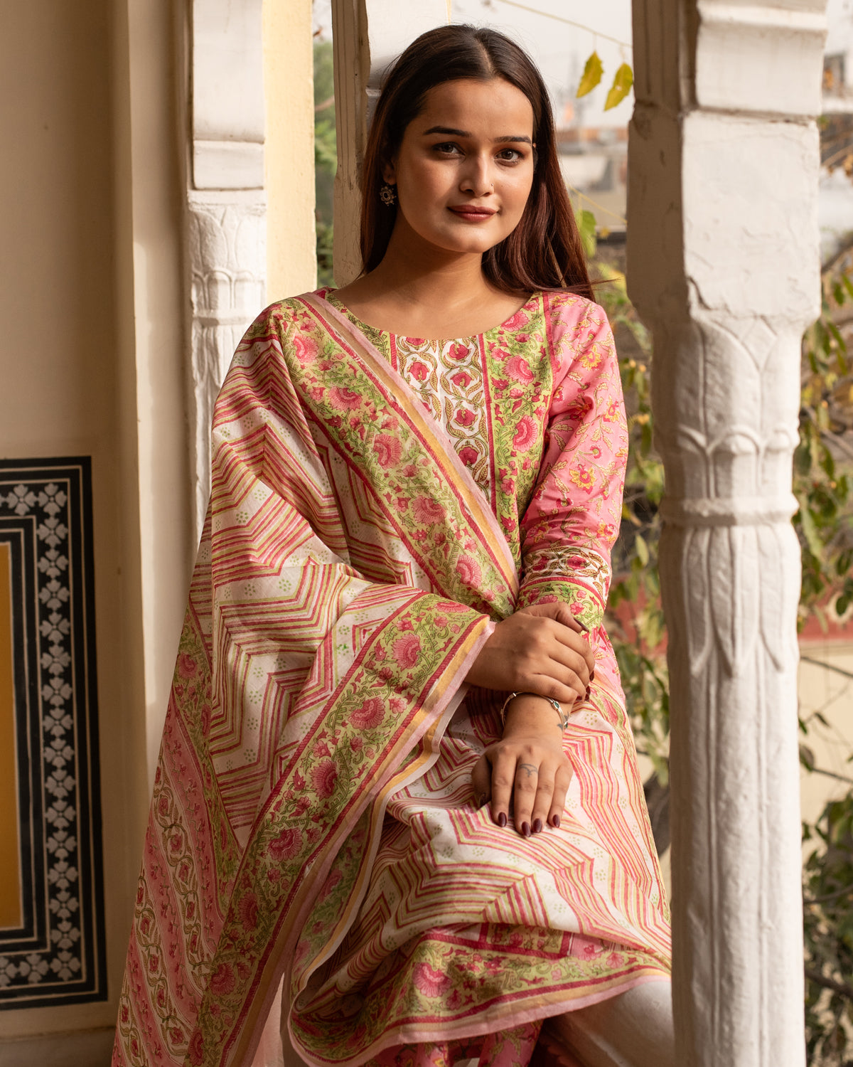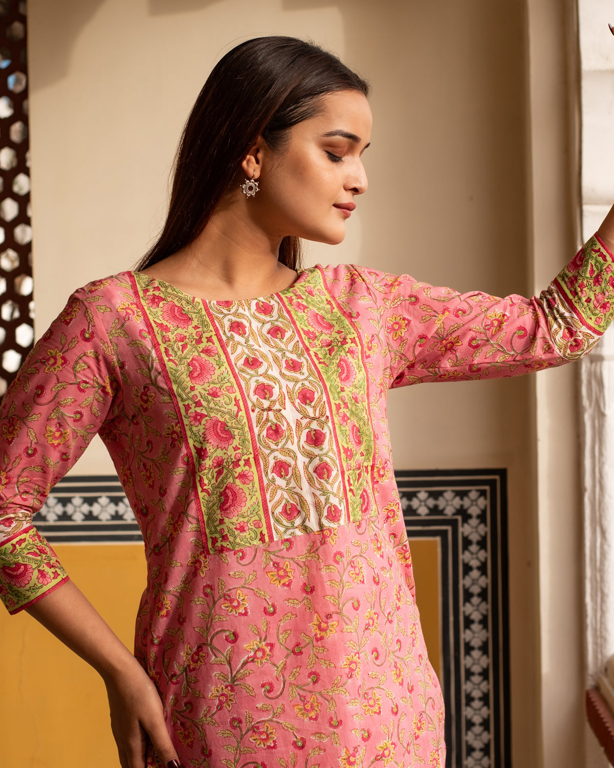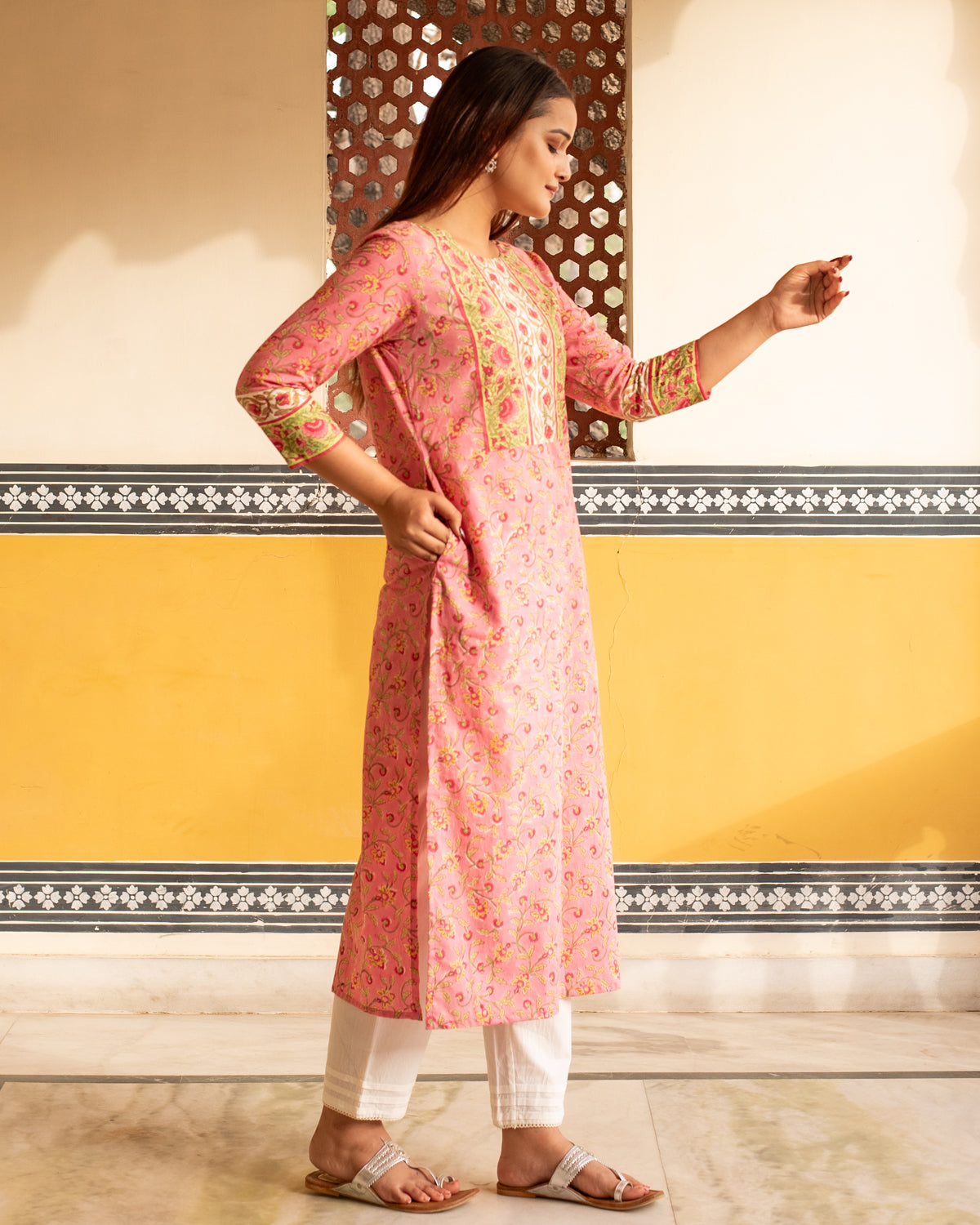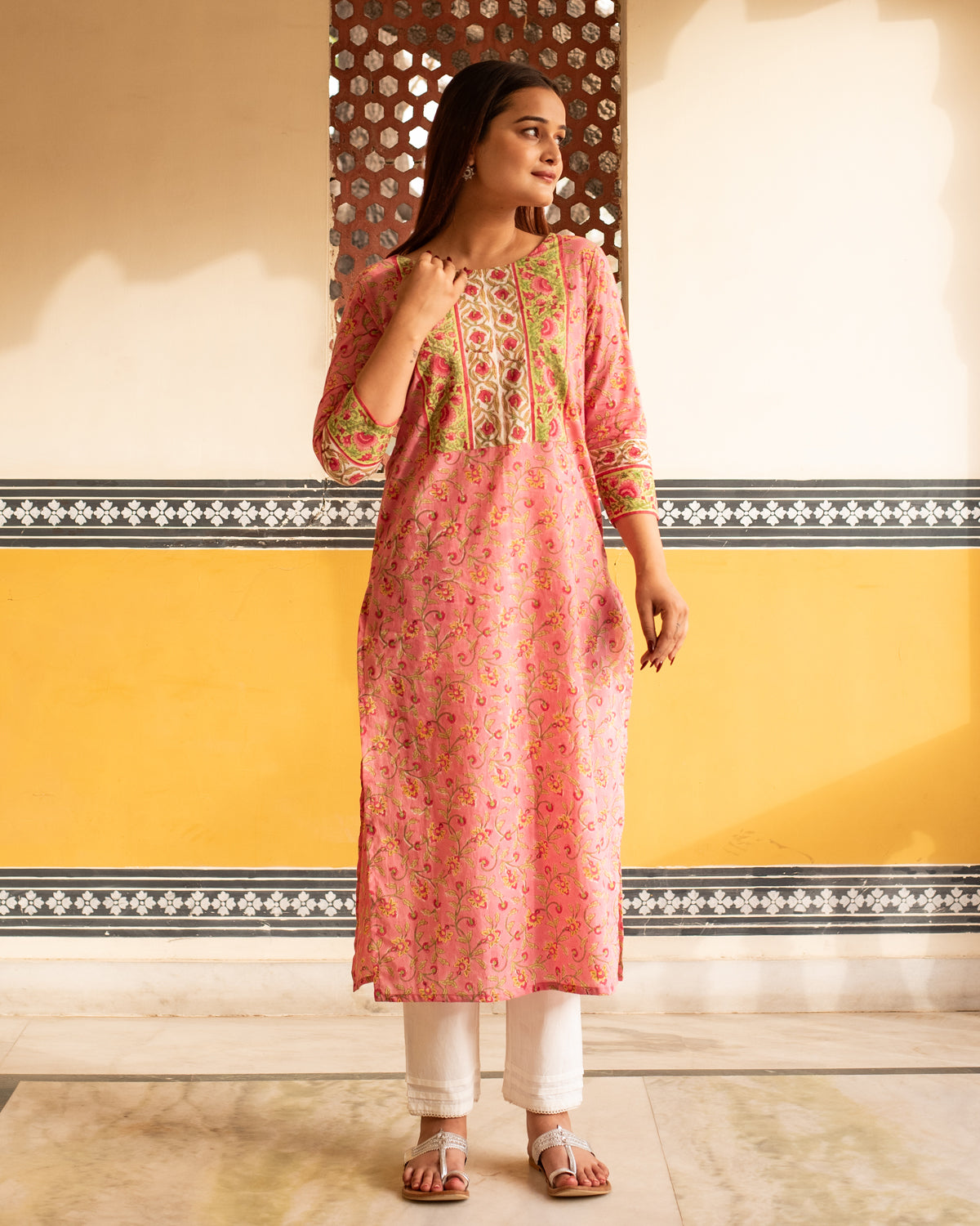 Hand block printed straight kurta featuring a striking yoke put together by a combination of borders and a classy boat neck. Contrast border detail at sleeve. Pair it with natural white narrow pleated Pants and printed Chanderi/ Mul-Mul/Kota doria dupatta with delicate hand stitched hemming.