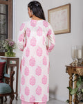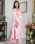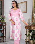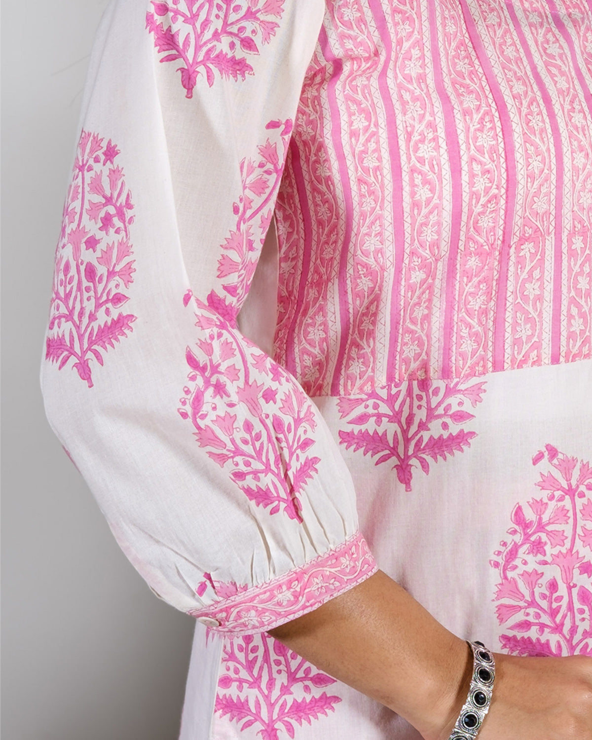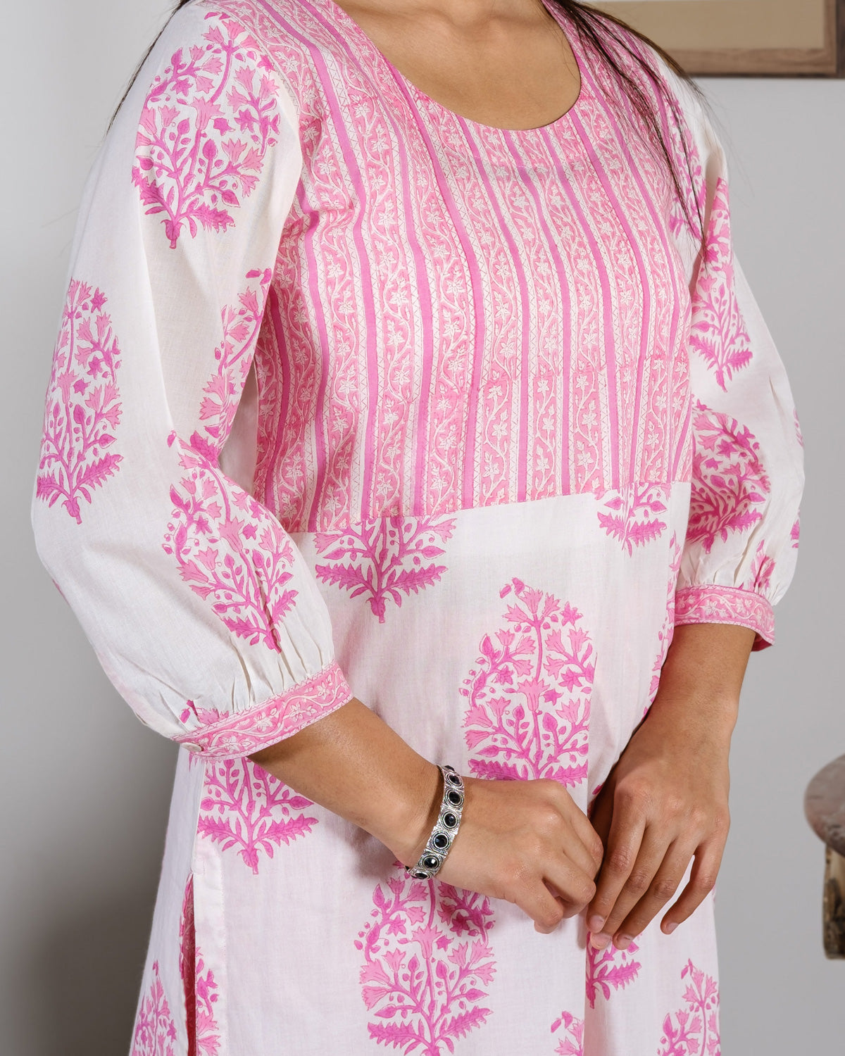Straight silhouette Kurta with Sanganeri buta hand block printed in shades of pink, featuring a yoke and gathered sleeve with cuff and placket.
