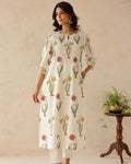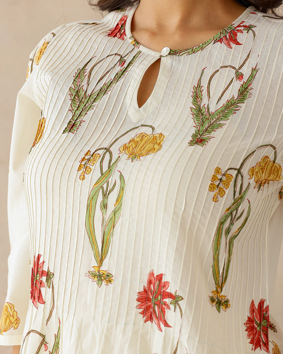 Hand crafted kurta in pure cotton fabric printed in a combination of floral butas. Featuring pin tuck detailing at the front and a round keyhole neckline.