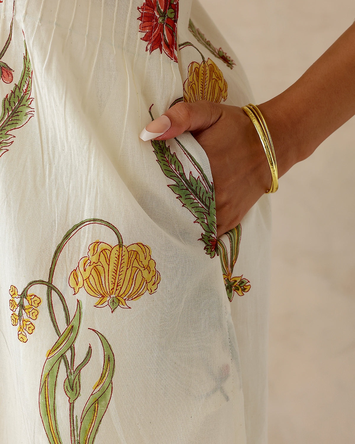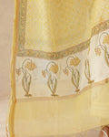 Paired with natural white narrow pleated Pants, featuring an elasticated waist with drawstrings and deep pockets on either sides and Daffodil buta print Chanderi/ Mul-Mul dupatta with delicate hand stitched hemming.